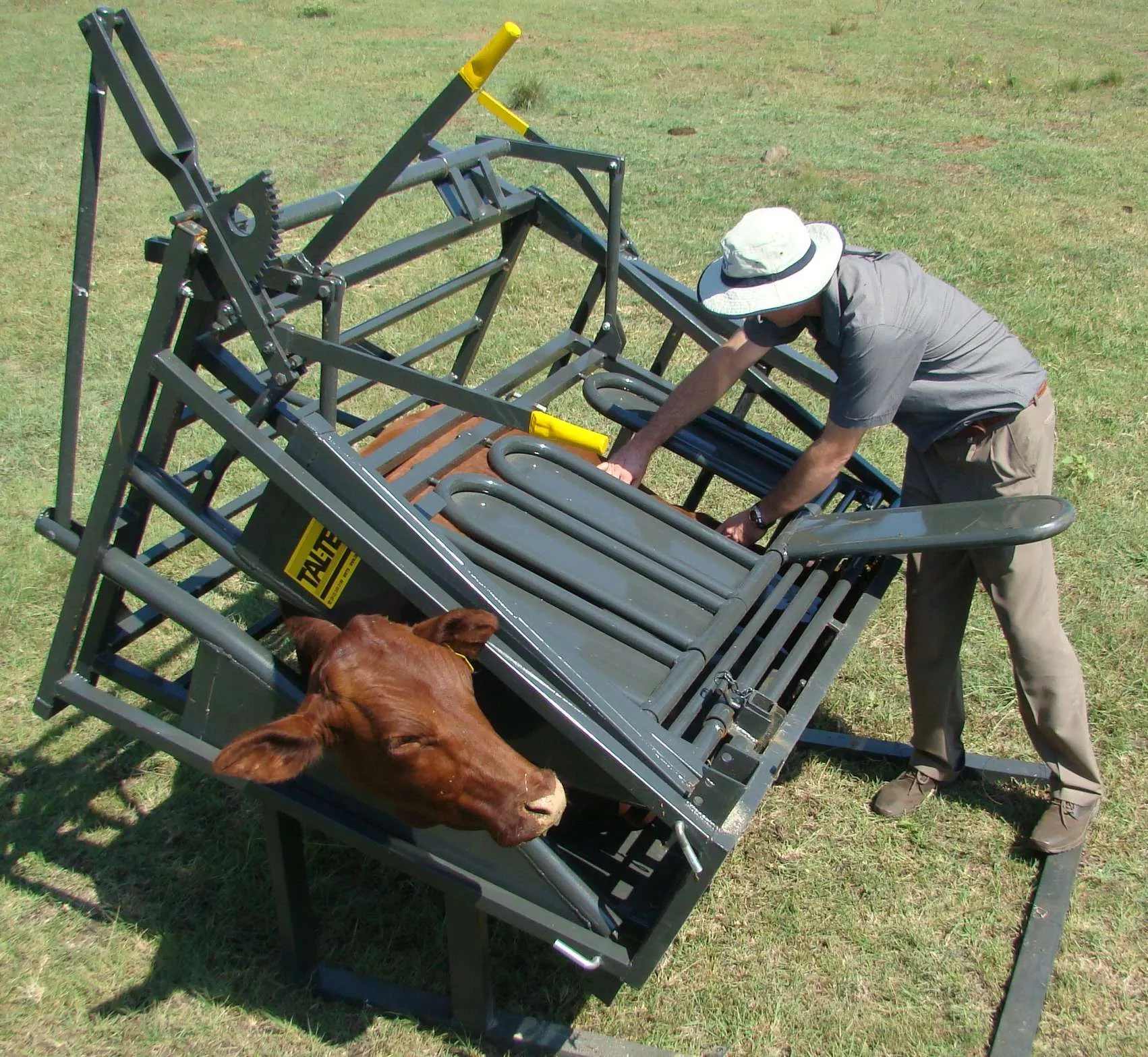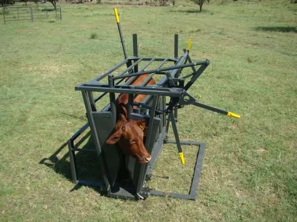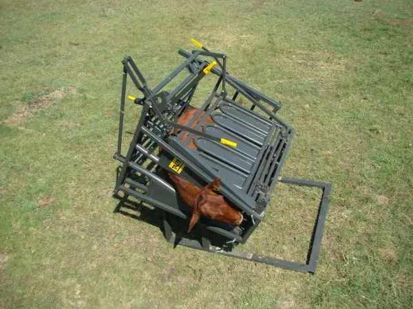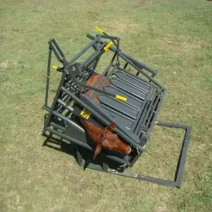 The calf and tollie tilt positions the animal on its right side, giving easy access to the left side for work or inspection through removable panels. It is designed for operation solely from the left side. Neck clamps can be attached at both ends, allowing access to both sides of the animal. This equipment is suitable for calves aged 10 weeks to 6 months, depending on the breed. Note that the Tollie Tilt cannot be used as a scale.
