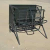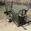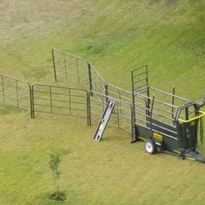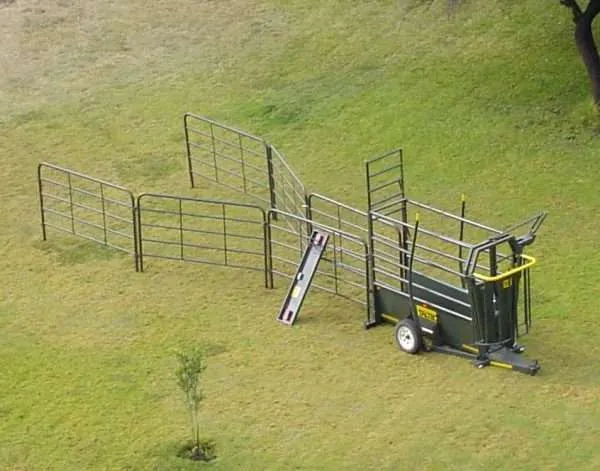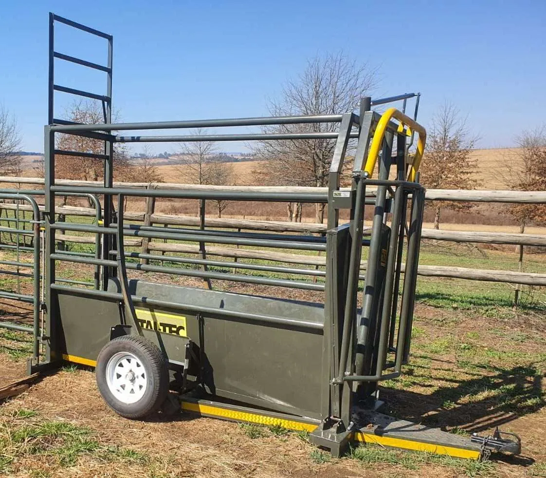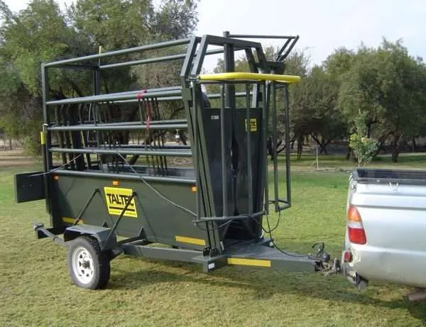 The cattle mobile crush is a 2.4m long unit on wheels, with a neck clamp at the front and a guillotine gate at the back. It is roadworthy and includes a chevron. You can add an LS4 scale with 1000mm loadbars to use it as a scale, which mounts at the bottom. The trailer can carry up to eight 2.3m kraal sides, and a spare wheel is available as an optional extra.