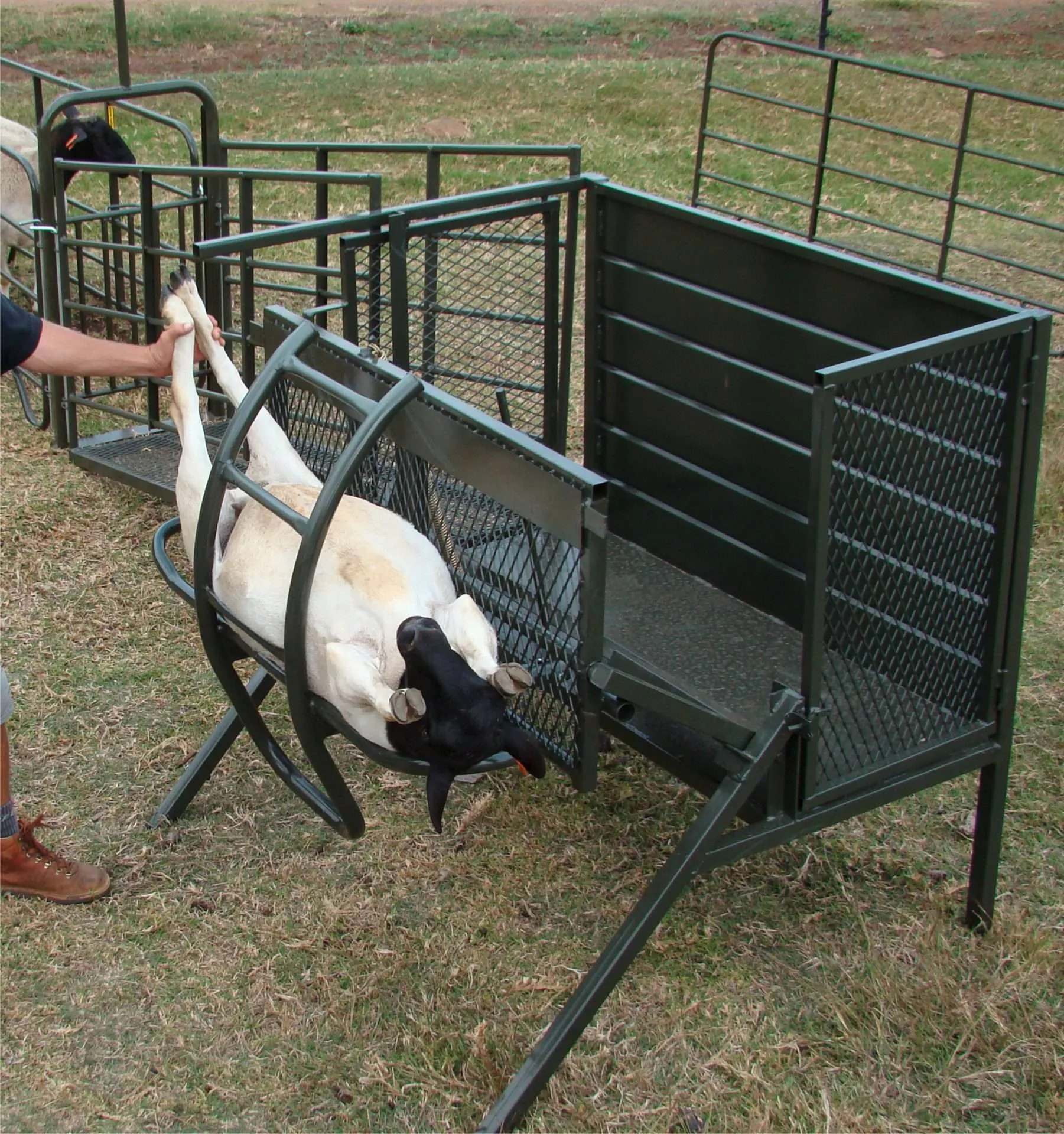 The sheep tilt is an excellent item for managing sheep. By tilting the sheep on its side, you create a stable platform that facilitates tasks such as dosing, hoof trimming, and inspections. This feature allows you to work at a comfortable height while keeping the sheep steady during procedures.