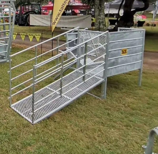 An optional ramp can assist in getting the sheep into the clamp. However, since sheep can usually jump out on their own, a ramp is not needed for their exit.