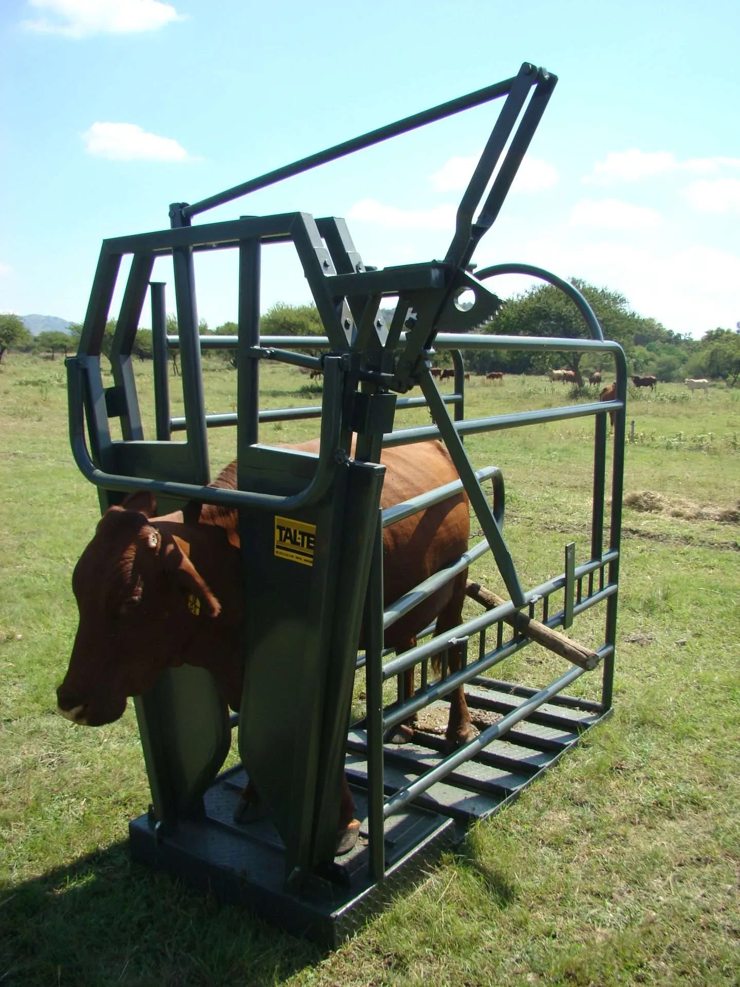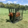 The vet clamp is designed for embryo transplantation and various veterinary procedures. It includes a Brahman neck clamp that fits all sizes and breeds of cattle. The floor features a 12-degree gradient, ideal for embryo transplantation as specified by veterinary surgeons. An optional box gate is available for convenient rear access to the animal. The clamp also has checker plate steps to prevent slipping, and a side panel allows you to push the cow sideways to limit movement.